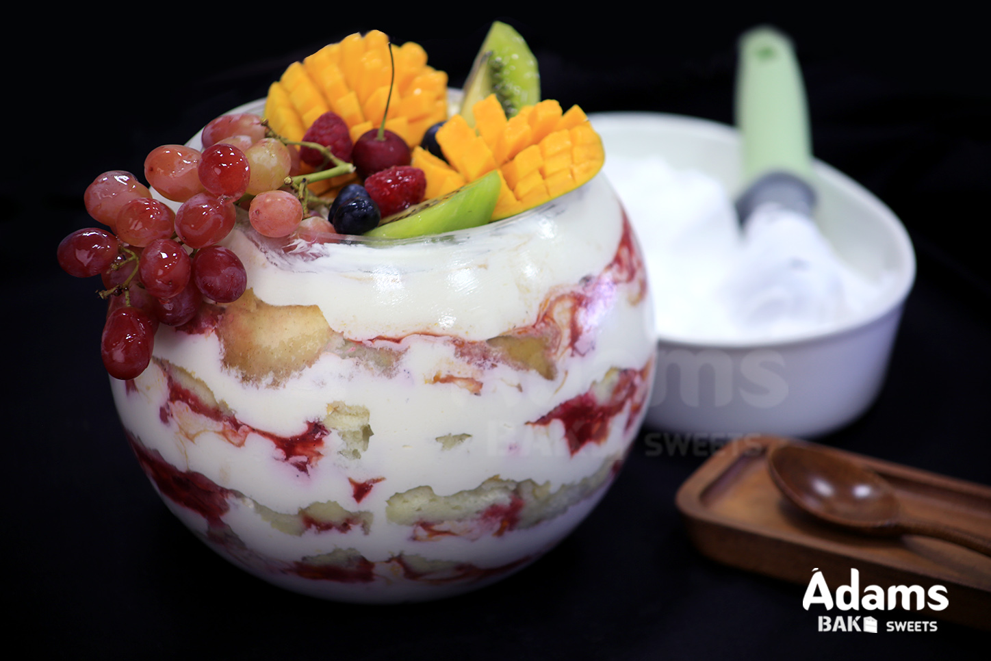 A glass bowl filled with our special cream, delicate vanilla sponge, fresh fruits and berries.