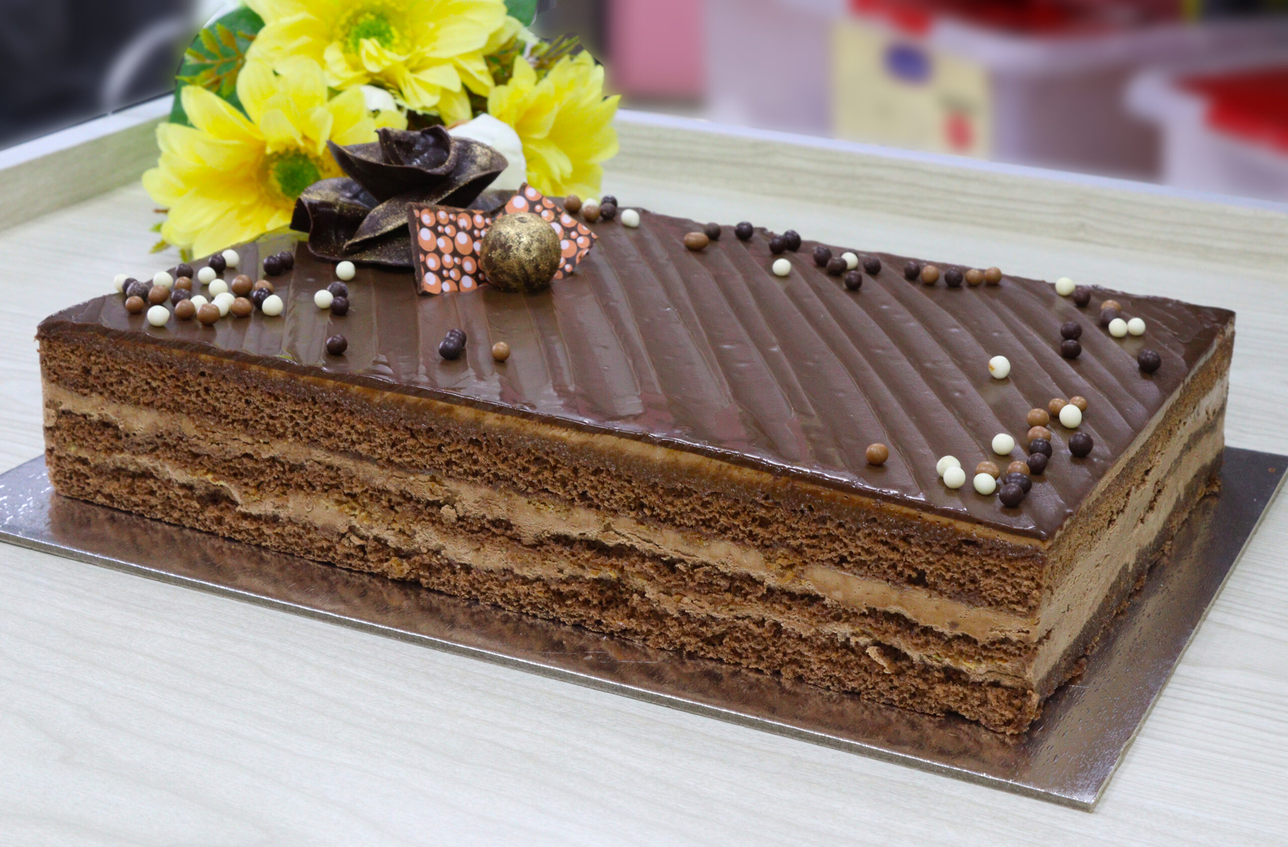 Rich Belgium chocolate with soft cocoa sponge layered with crunchy French chocolate mousse for a luxurious dessert experience