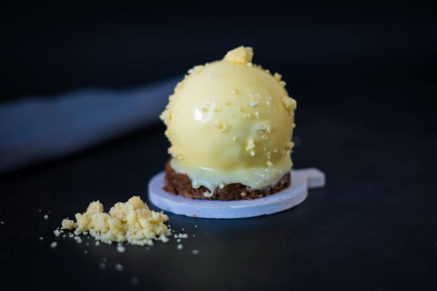 cheese ball filled with raspberry jelly and base with chocolate brownie.