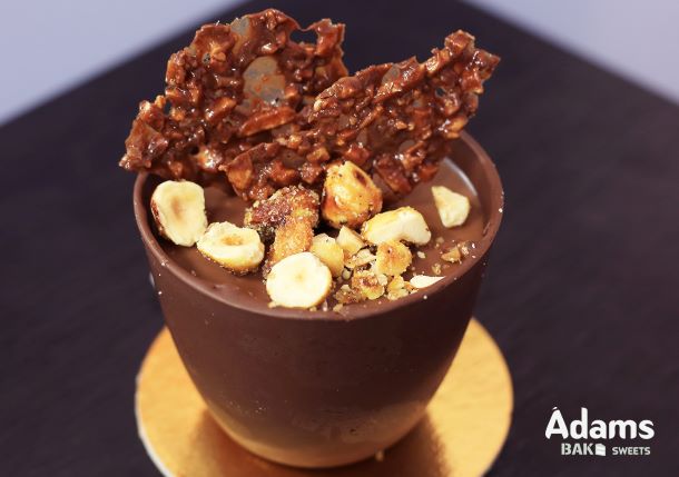 Chocolate cup full of milk chocolate, hazelnut mousse, nuts and topped with almond tuile.